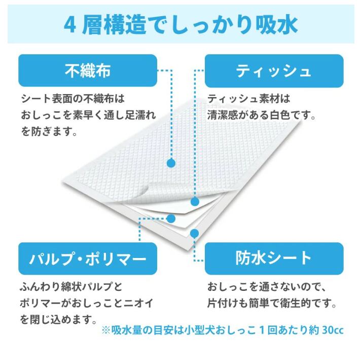 【素材】表面材:ポリオレフィン系不織布、吸水材:綿状パルプ・吸収紙・高分子吸収材、 防水材:ポリエチレンフィルム、結合材:ホットメルト粘着材